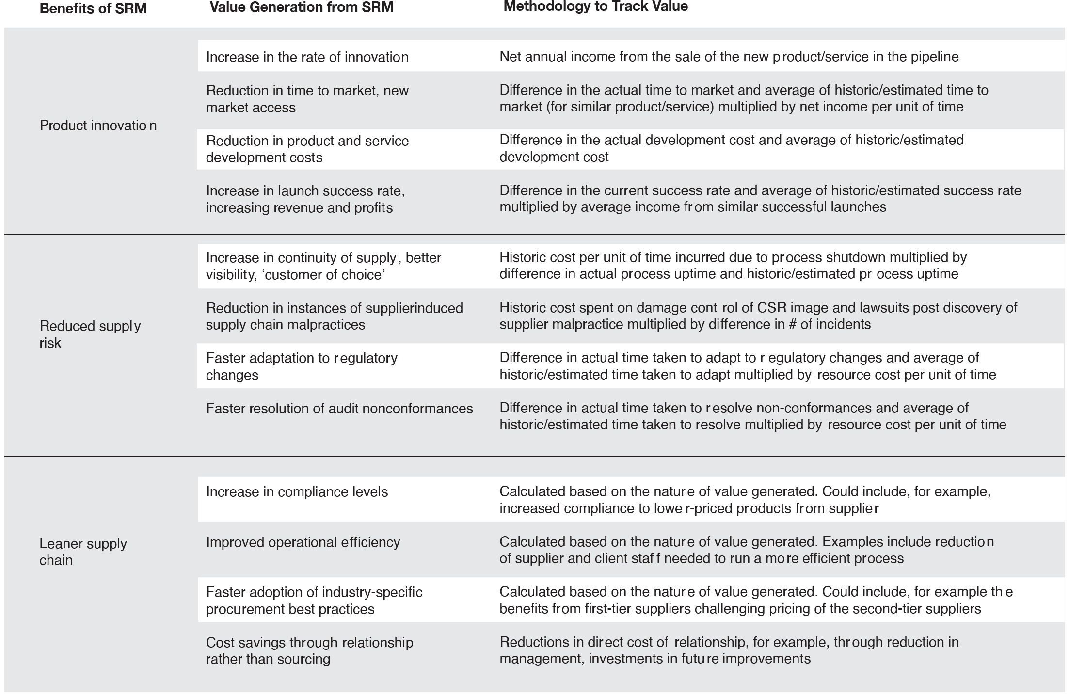 In reality, SRM is a relatively long-term process that requires a cross-functional and coordinated approach, a robust governance structure, and innovative methodologies to track and measure value. Many organizations fail to measure the benefits from SRM initiatives objectively, resulting in the program getting abandoned midway or dragging on unfulfilled on the procurement agenda — without any gain and sign of real benefits — inevitably impacting investment and business focus.