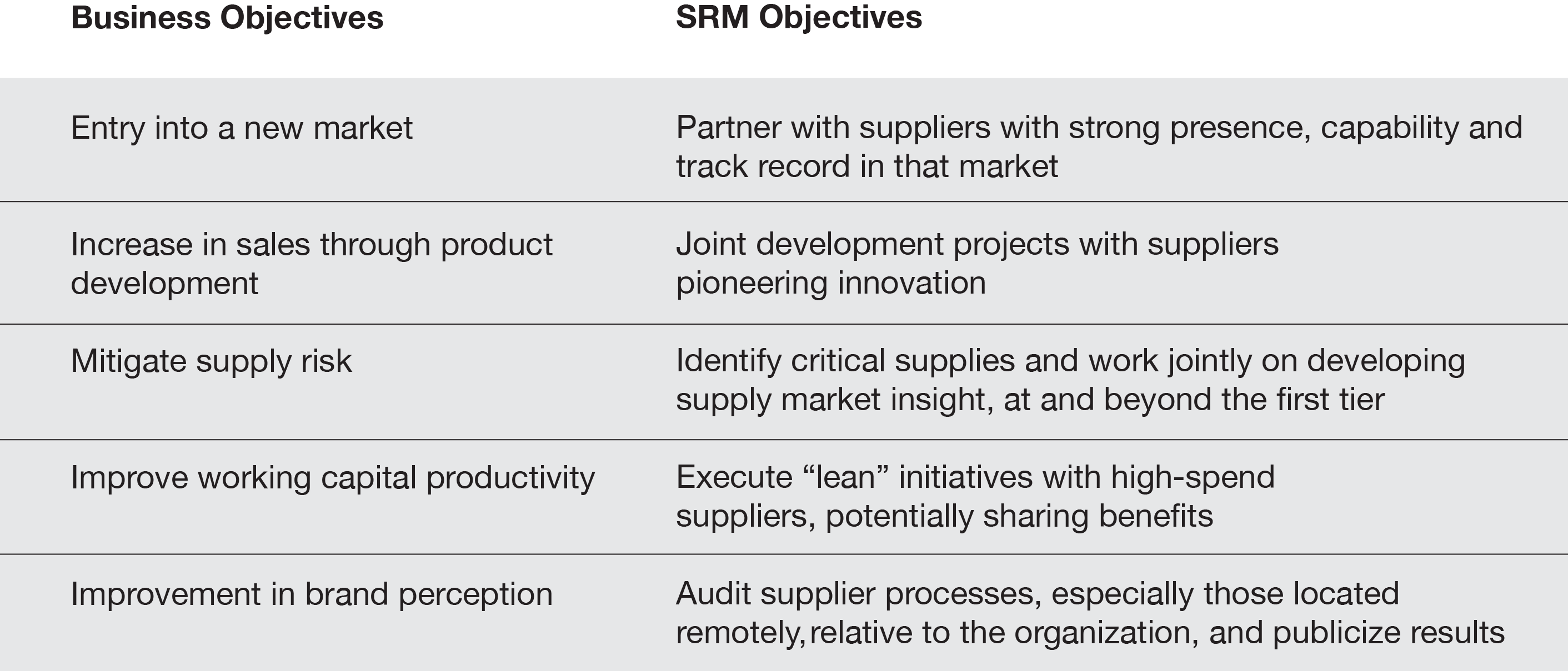 The best approach for ensuring alignment is to translate business strategy into SRM objectives. For example, if the wider business strategy is to expand business in emerging markets, then an SRM objective could be to identify suppliers from the existing base who have a strong presence in the target emerging markets. Enterprises can use the support of their suppliers to develop business in these new markets, using their market knowledge through joint marketing, joint ventures, or other strategies.