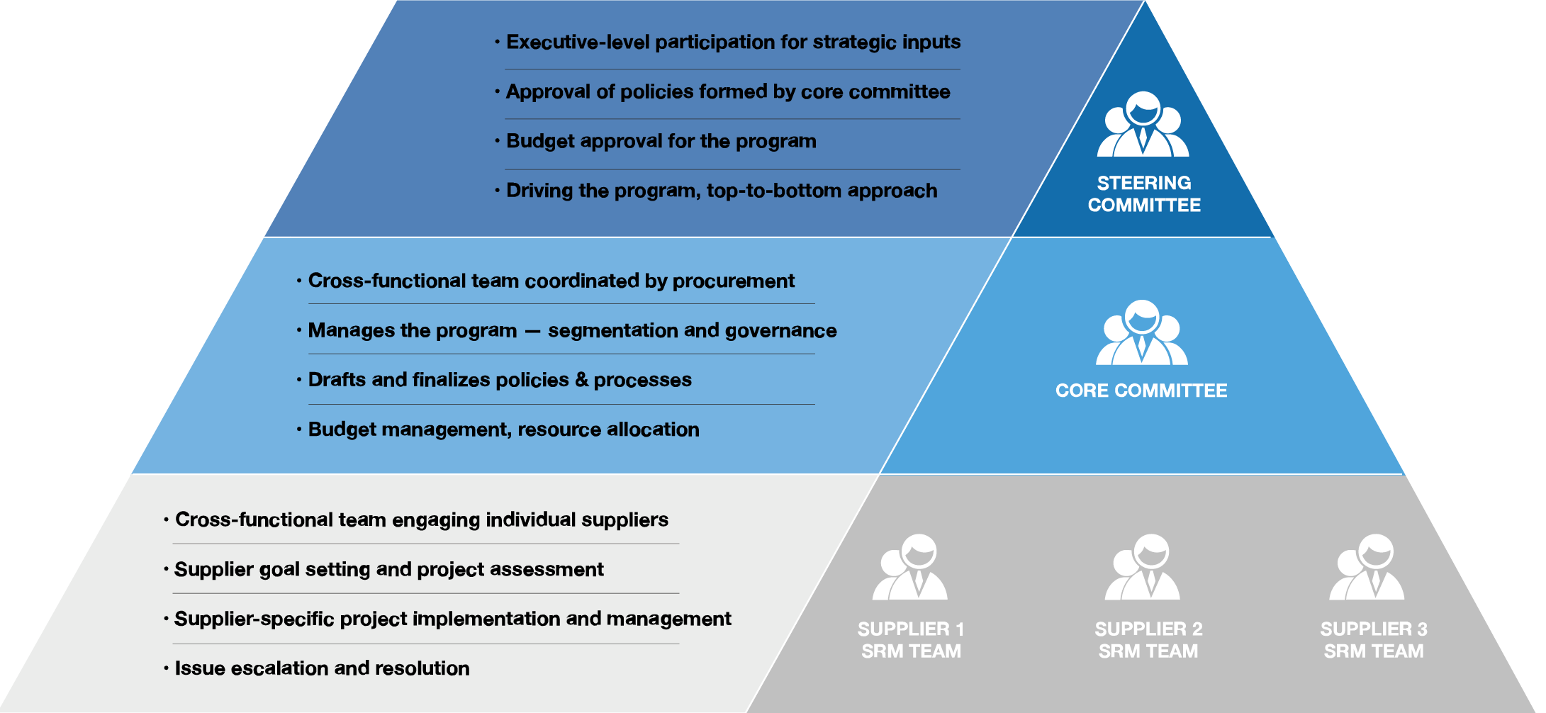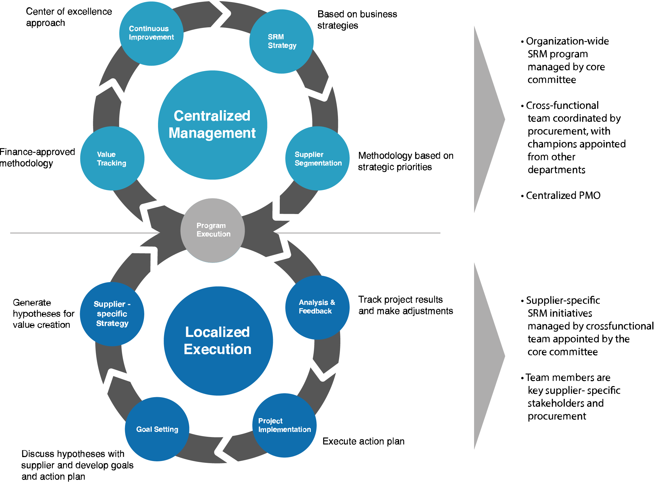 Centralized management and localized execution is the approach to adopt for execution of the overall SRM program. The core committee will be responsible for overseeing the program execution and handling the overall program management, whereas, the localized cross-functional team will be responsible for the supplier-specific initiative.