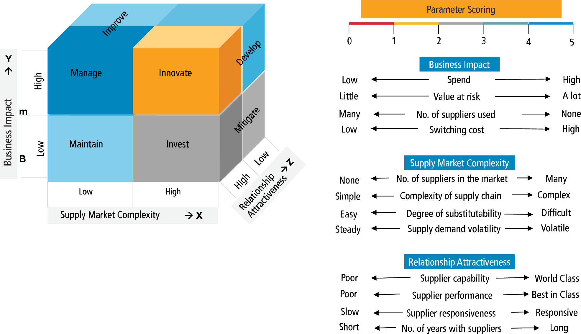 Figure 6 is the GEP SRM Cube used for effective segmentation of suppliers for SRM. By taking a weighted average of the different sub-parameters organizations can design their own scoring methodology for supplier segmentation.
